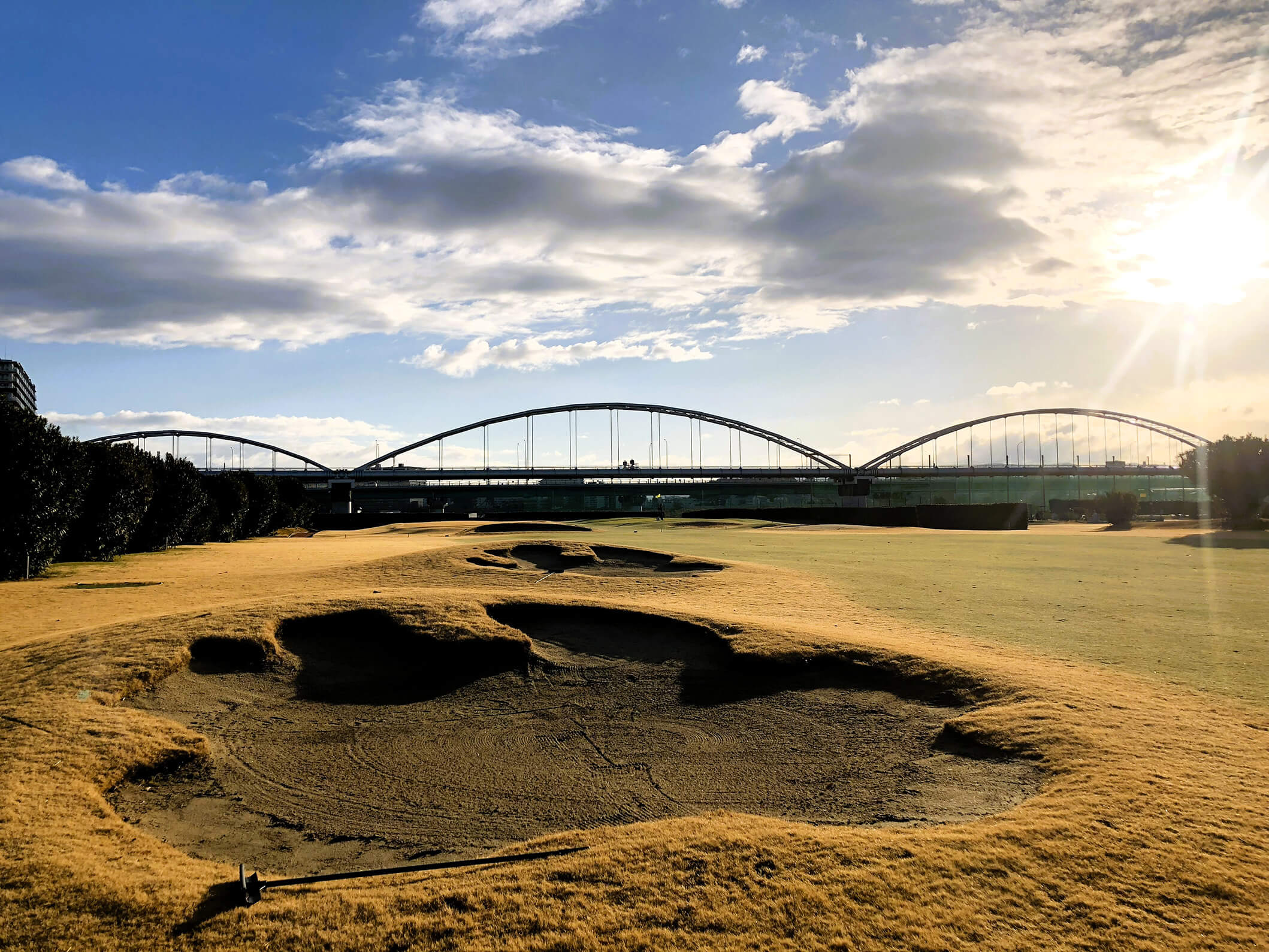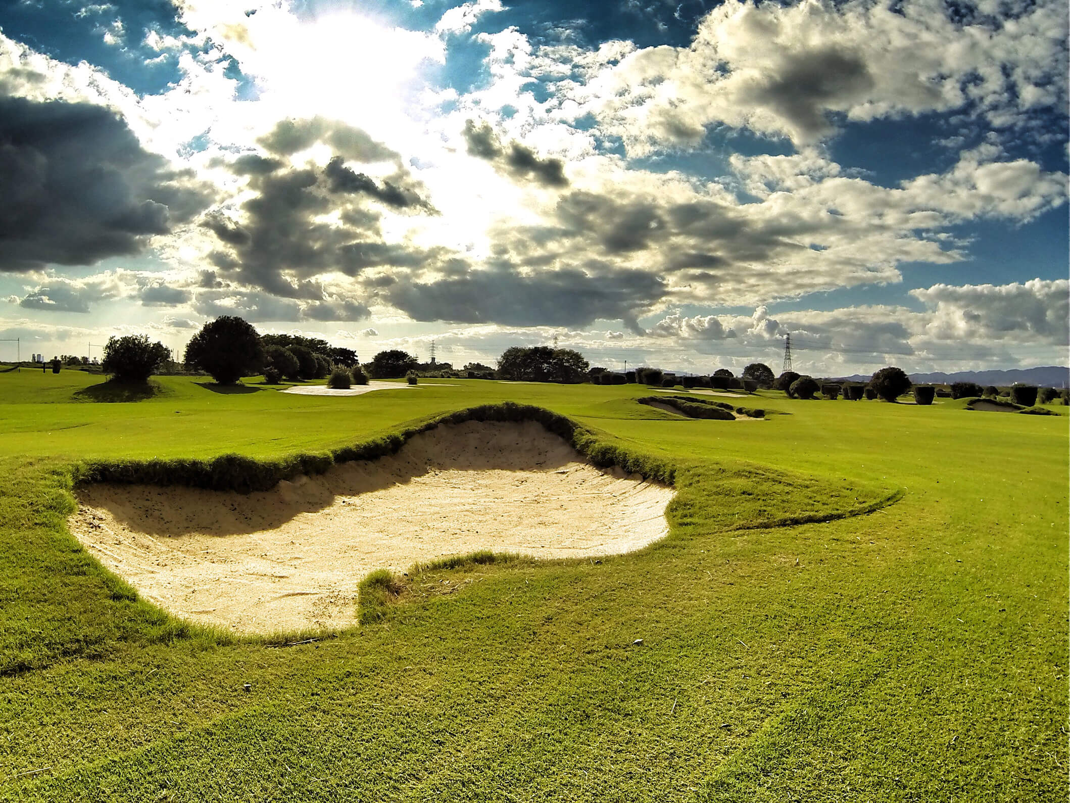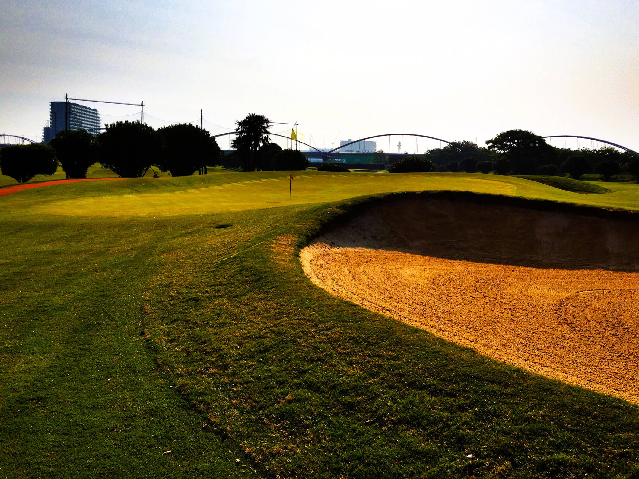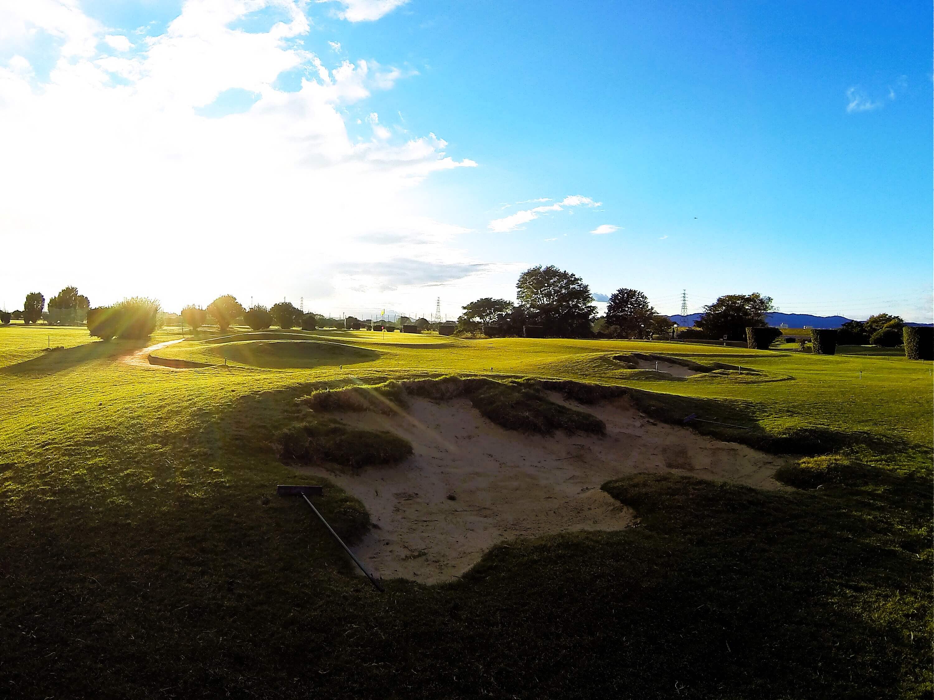 荒野のような巨大なガードバンカーと、高槻で最も難易度が高いローリンググリーンが特徴的なパー4。