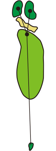マウンドに囲まれた2段グリーンへの正確なアプローチが必要とされるパー4です。