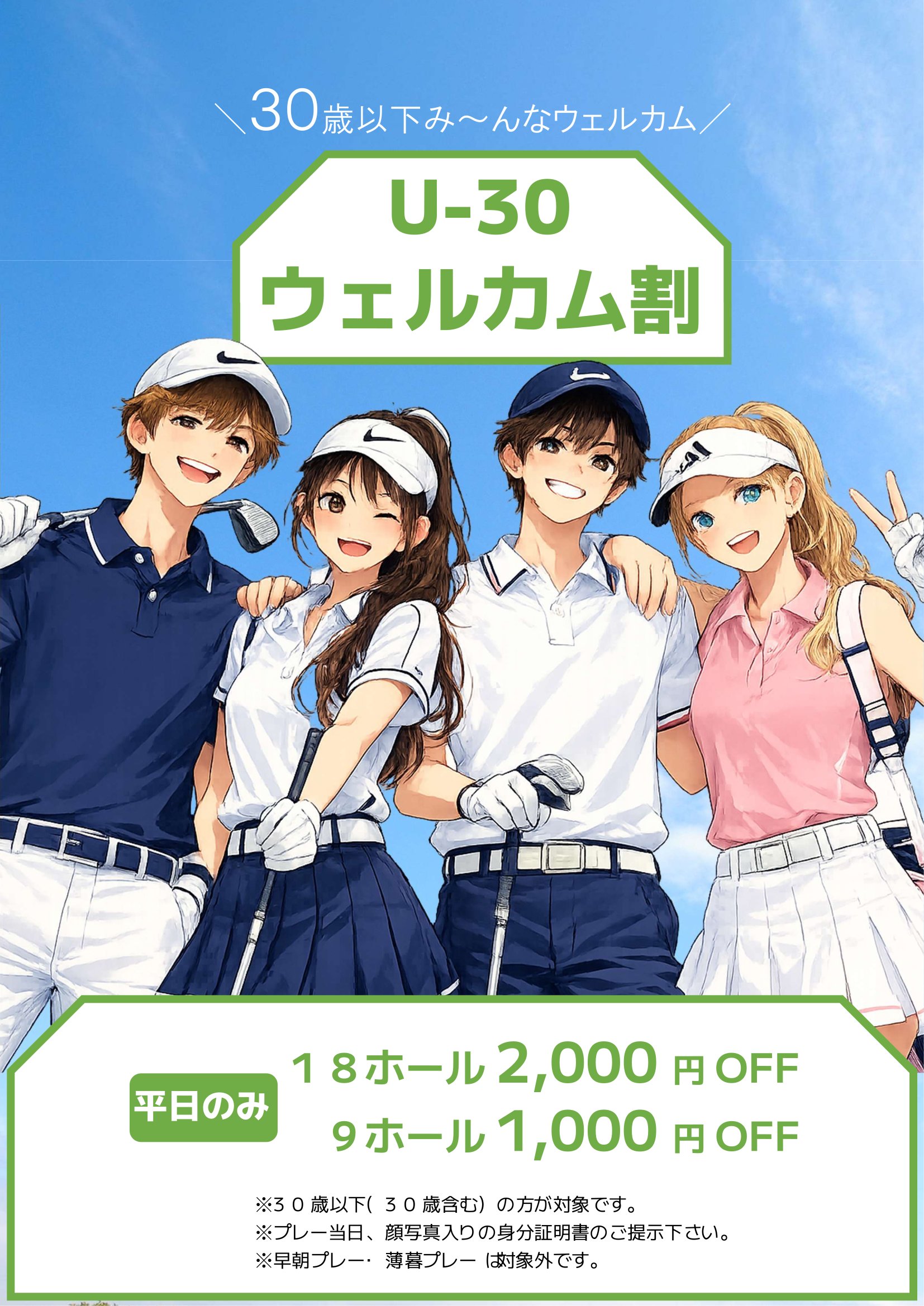 30歳以下の方は18H2,000円OFF、9H1,000円OFFでプレーいただけます。